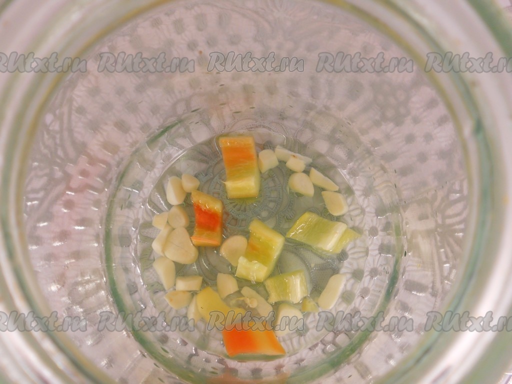 Банки простерилизовать. Чеснок очистить и нарезать, перец сладкий болгарский очистить от семян и нарезать средними кусочками. Для такой заготовки нужно выбирать баклажаны небольшие и лучше всего консервировать их в банках объемом 2 литра. Если баклажаны крупные - допускается разрезать их пополам. На дно каждой банки влить уксус (расчет такой - на одну трёхлитровую банку - 100 мл уксуса, т.е. для двухлитровой банки нужно 66 мл, для литровой - 33 мл). Добавить горсть сладкого перца и немного чеснока.