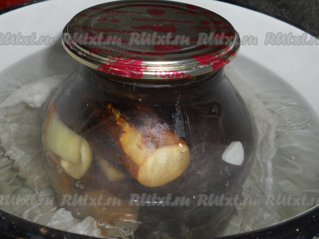 После этого залить все банки с баклажанами кипящим рассолом доверху (в котором они варились), накрыть стерилизованными крышками. Стерилизовать банки в кипящей воде: 2-х литровые - 15 минут, литровые - 10 минут. Для стерилизации: в большую кастрюлю влить воду, на дно поместить мягкую тряпочку, поставить на огонь. Нагреть воду до горячего состояния, поставить в кастрюлю банку с баклажанами, чтобы вода была по "плечики". Далее довести воду до кипения и отсчитывать время стерилизации с момента закипания воды.