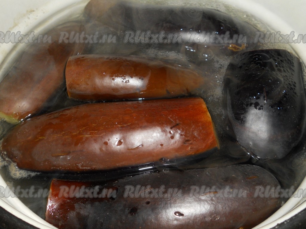 В большую кастрюлю налить воду (не менее 6 литров), довести до кипения, всыпать соль (расчет соли: на 3 литра воды - 200 грамм соли). Когда соль растворится, отварить в этом рассоле баклажаны, предварительно удалив хвостики и поколов их в нескольких местах. Варить нужно партиями, не более 7-8 минут с момента закипания.