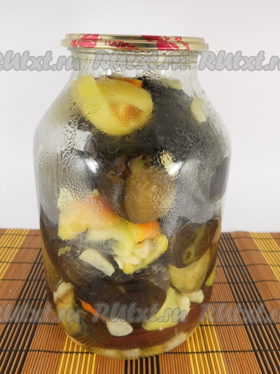 Банки сразу же закатать, перевернуть и укутать одеялом до полного остывания. Затем отличную заготовку - баклажаны, консервированные целиком, - отправить на хранение. Хранятся такие баклажаны в кладовке городской квартиры.