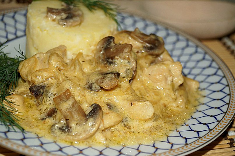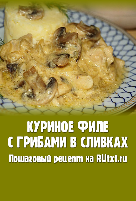 Очень вкусное, нежное куриное филе, приготовленное с грибами в сливочном соусе с сыром, в горячем виде подать к столу с гарниром. Мне очень нравится подавать это блюдо с картофельным пюре.