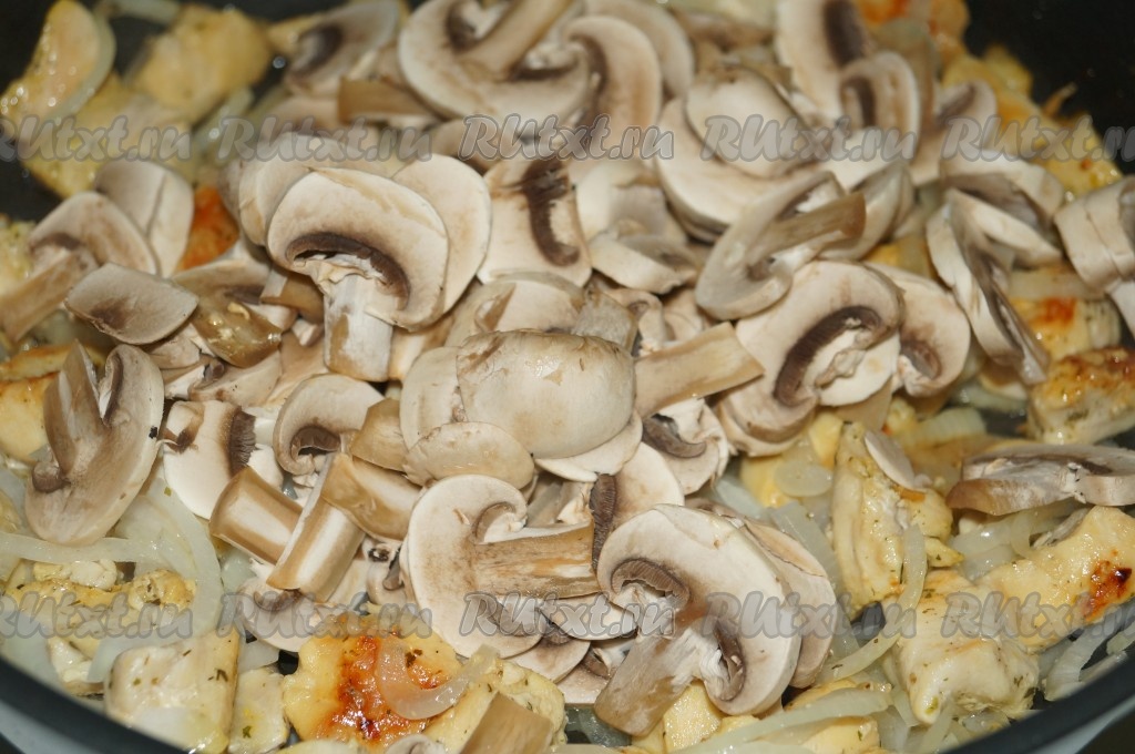 Шампиньоны вымыть, нарезать на тонкие пластины, выложить к куриному мясу и луку, перемешать, обжарить всё вместе в течение 10-15 минут, не забывая время от времени перемешивать.