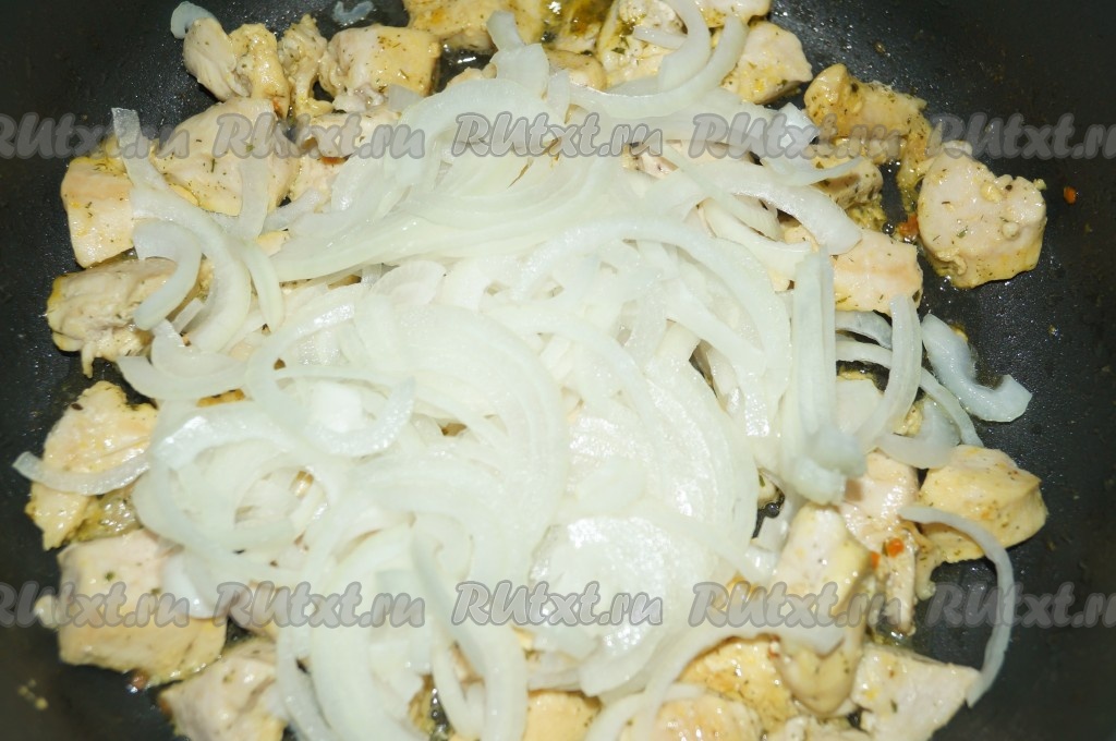 Лук очистить, нарезать на полукольца, выложить к обжаренному куриному филе, посолить, приправить специями, перемешать. Обжаривать лук с куриным филе на огне ниже среднего минут 7.