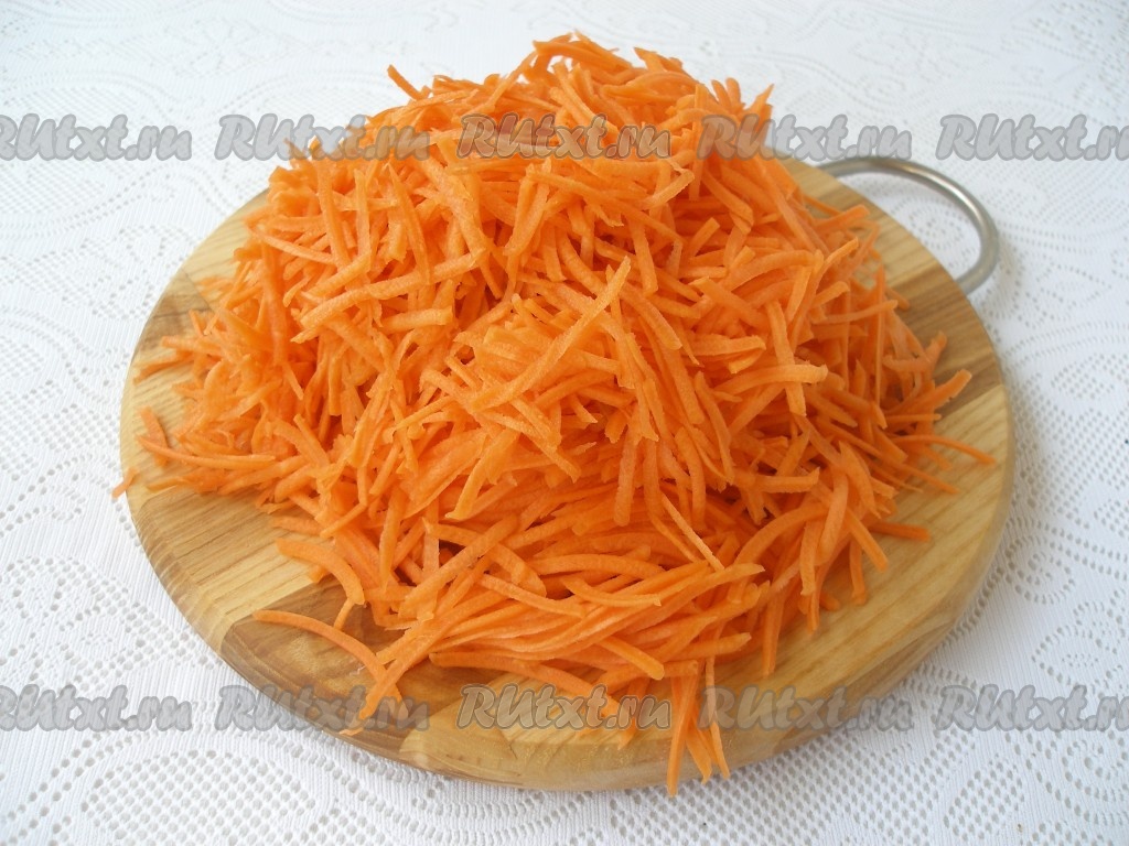 Морковь очистить и натереть на терке или в комбайне. Будет красиво и вкусно, если морковь натереть длинными полосочками.