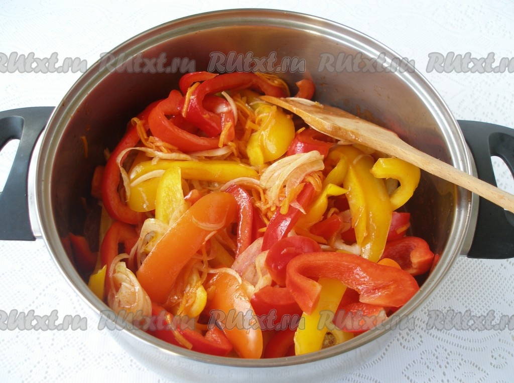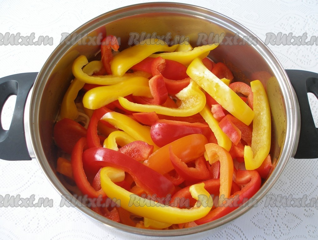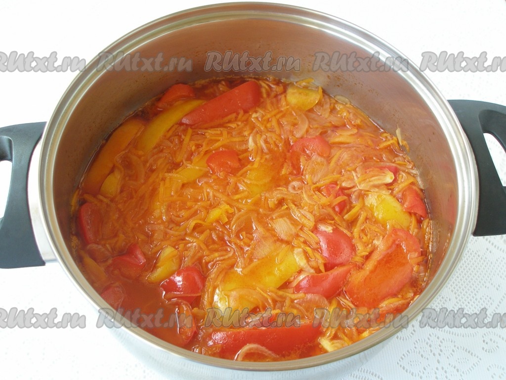 Аккуратно все перемешать и варить до готовности перца (примерно 20 минут). Перец должен стать мягким, легко протыкаться ножом, но не разваливаться.