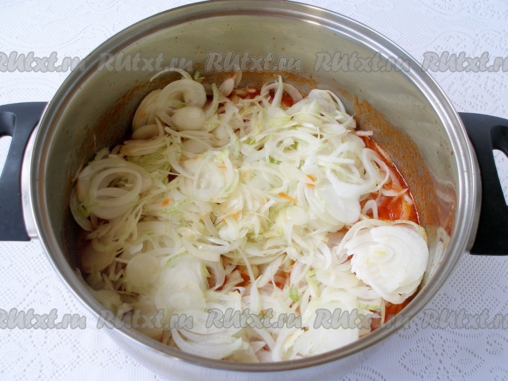 Затем добавить в кастрюлю репчатый лук, перемешать.