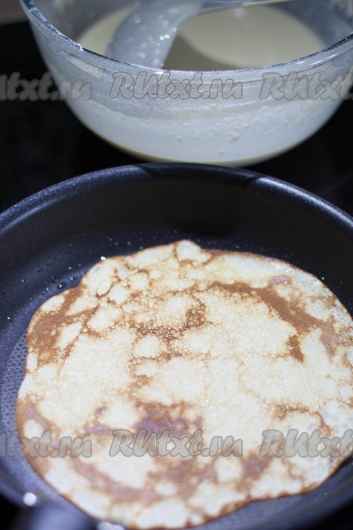 Обжаривайте блинчики с двух сторон на среднем огне до золотистого цвета. Второй стороне блинчика потребуется меньше времени для зарумянивания.