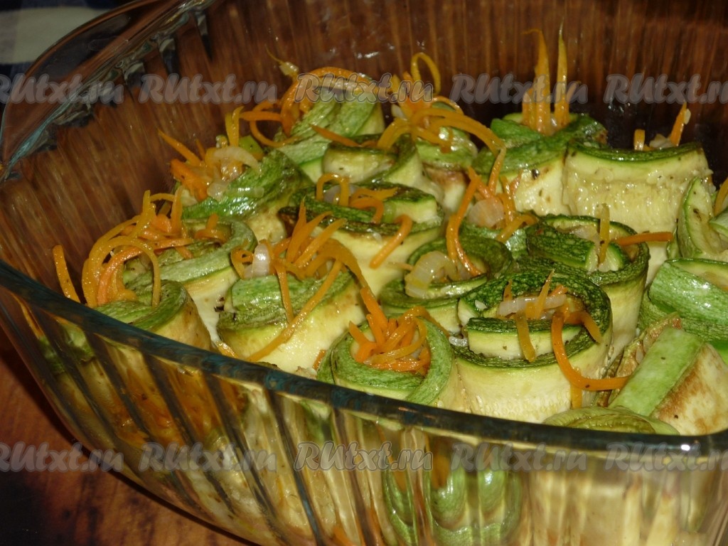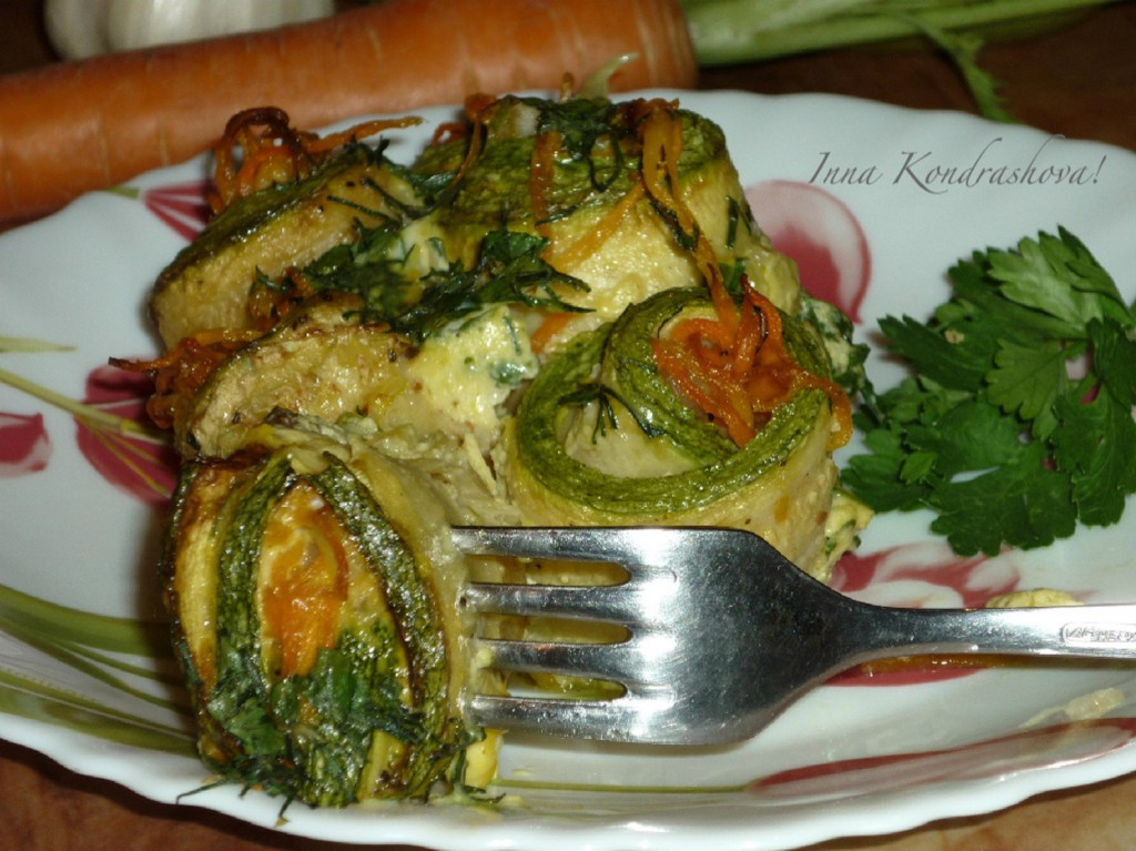 На каждый кабачковый слайс выложить понемногу обжаренных моркови и лука, свернуть рулетиком. Получится много рулетиков из кабачков.