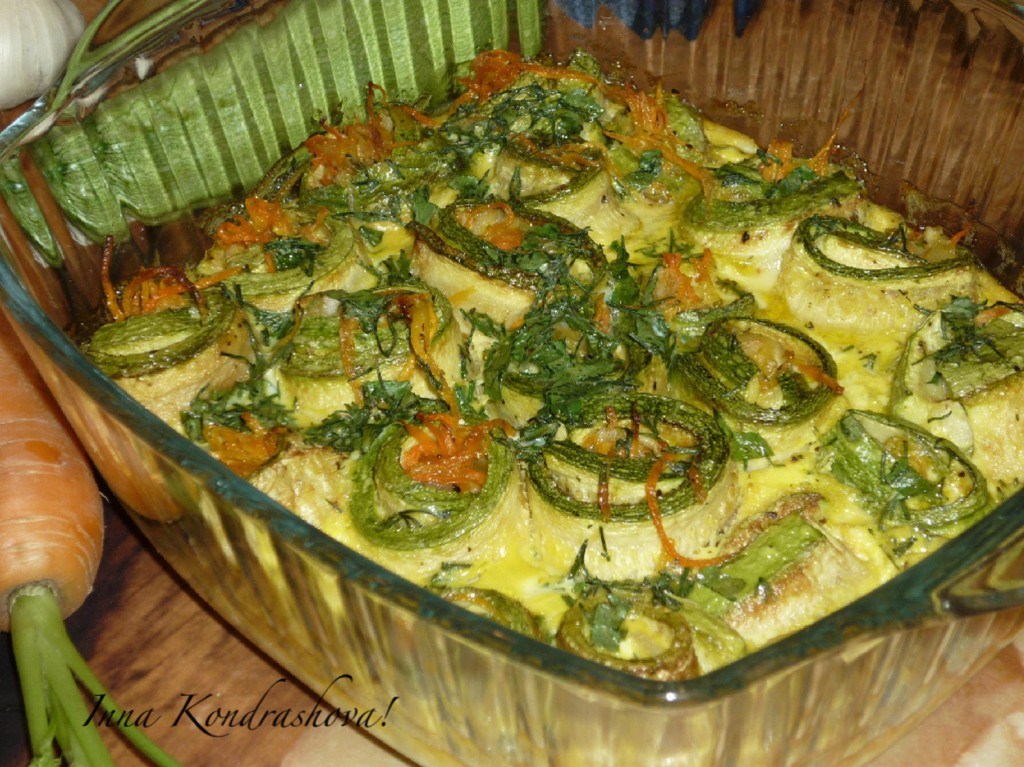 Рулетики залить приготовленной яично-сметанной смесью и отправить в разогретую до 180 градусов духовку. Готовить овощную запеканку с кабачками до золотистой корочки.
