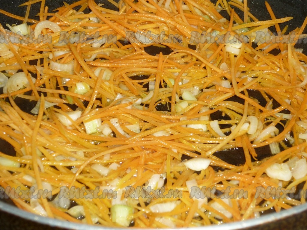 Лук и морковь обжарить на растительном масле до золотистого цвета.