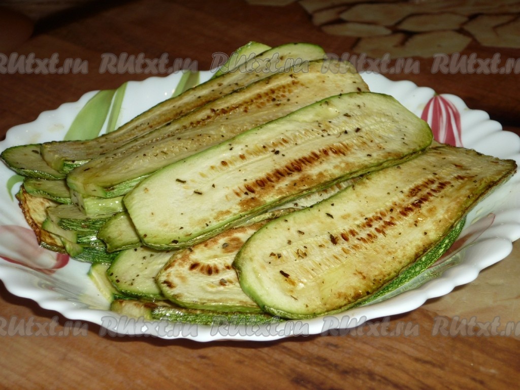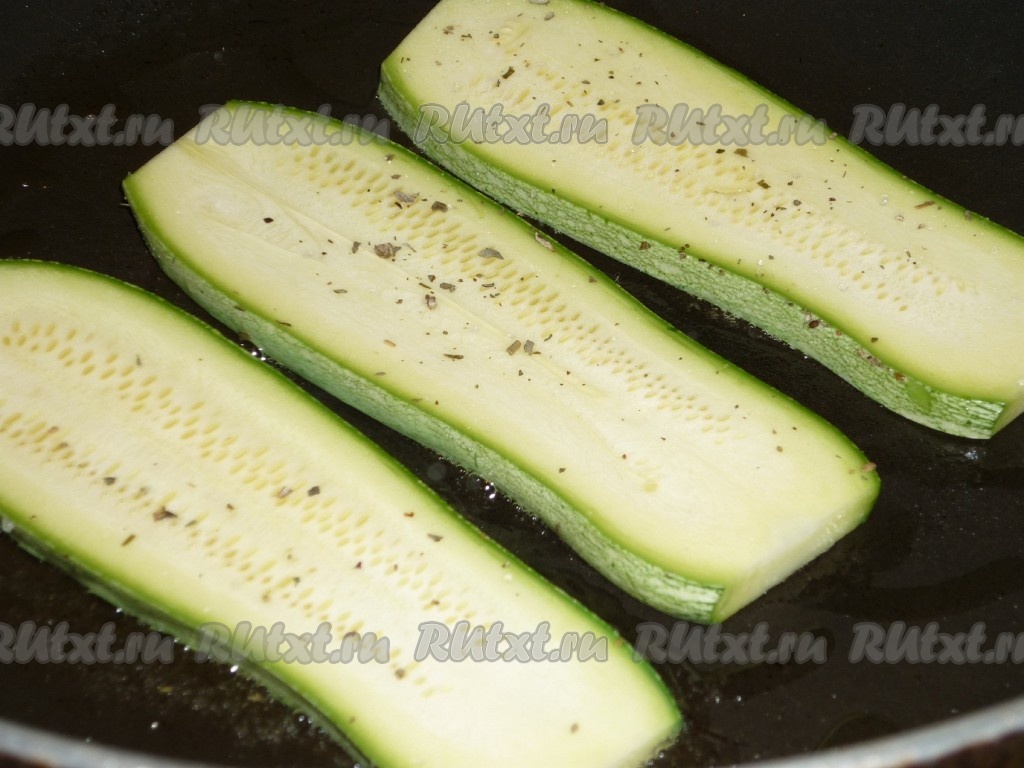 Кабачковые слайсы обжарить в небольшом количестве растительного масла на разогретой сковороде