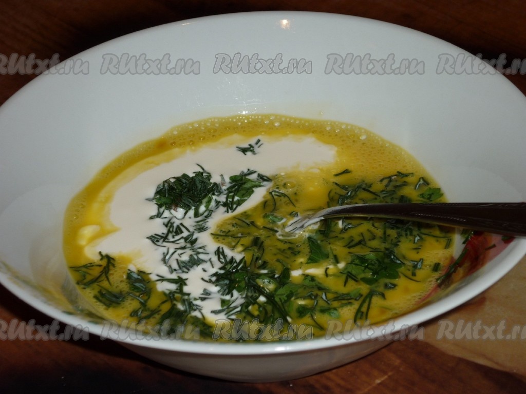 В глубокой тарелке яйца слегка взбить вилкой с мелко нарезанной зеленью, сметаной, молотым перцем и солью до однородной массы.