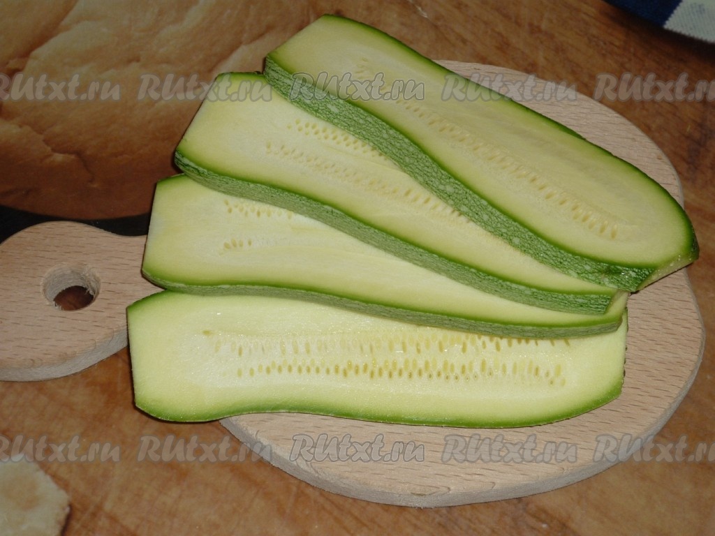 Кабачки вымыть, обсушить, нарезать тонкими слайсами, посолить и поперчить по вкусу.