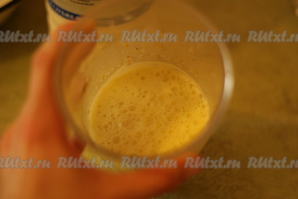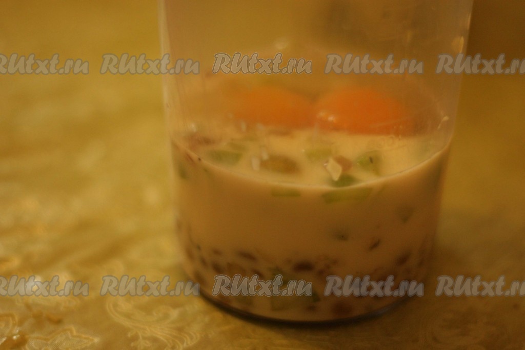 В чашу блендера выкладываем полученную смесь, добавляем молоко и яйца.