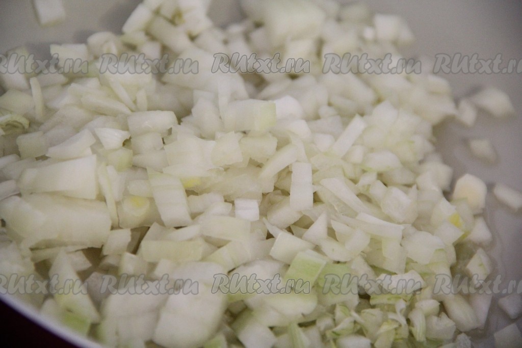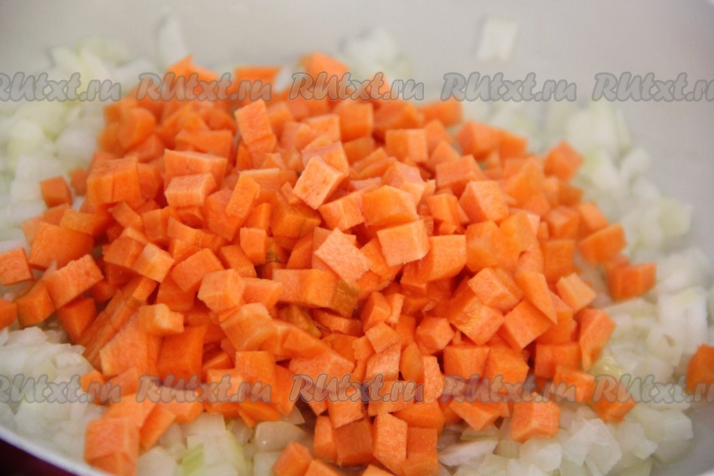 Морковь почистить и нарезать мелкими кубиками (по желанию можно морковь натереть на крупной тёрке). Добавить морковь к луку и перемешать.