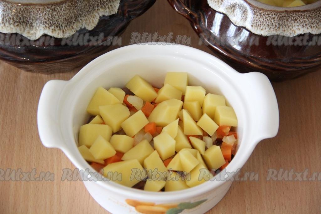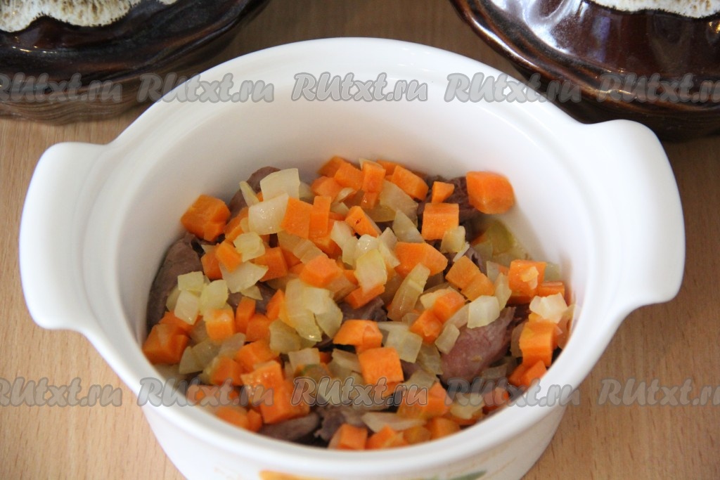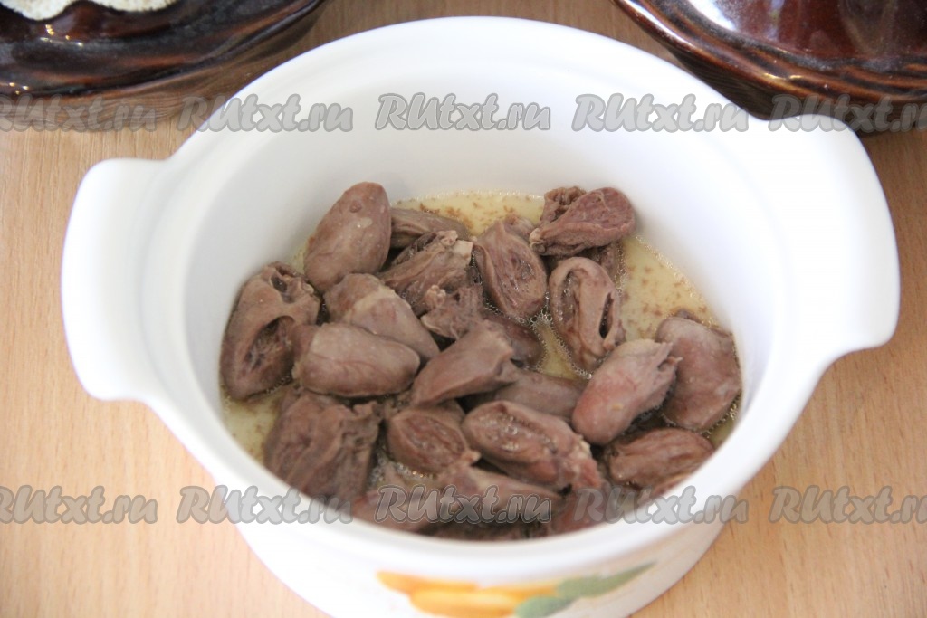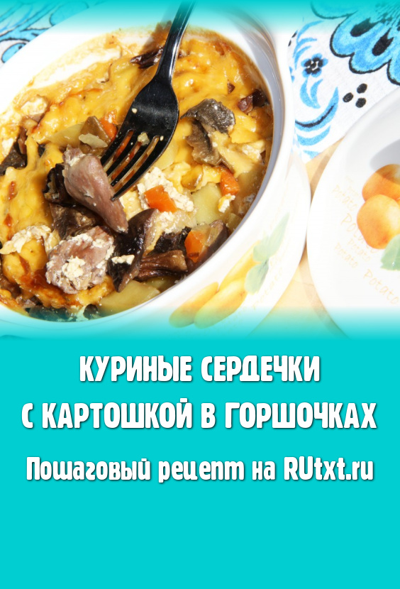 Выложить на дно горшочков куриные сердечки. И поровну разделить сок от сердечек, образовавшийся в процессе жарки, разлив его по горшочкам. У меня получилось 2 горшочка объёмом по 800 мл и 1 горшочек объёмом 500 мл.