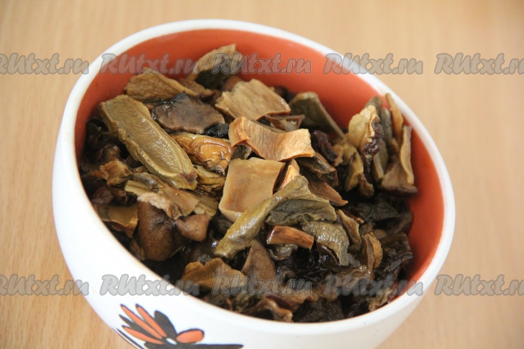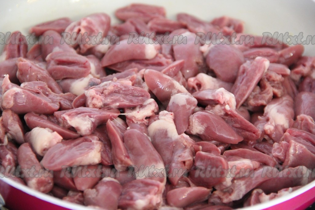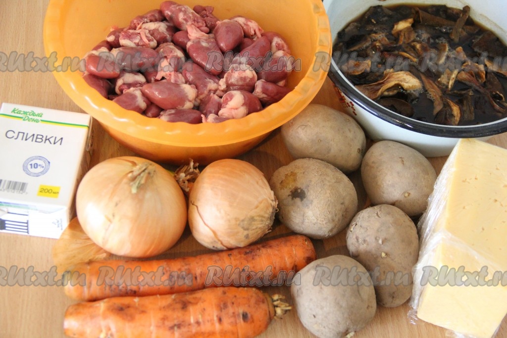 Подготовить продукты. Грибы предварительно залить кипятком и оставить на 15 минут. Сердечки вымыть, срезать лишний жир и сосуды.