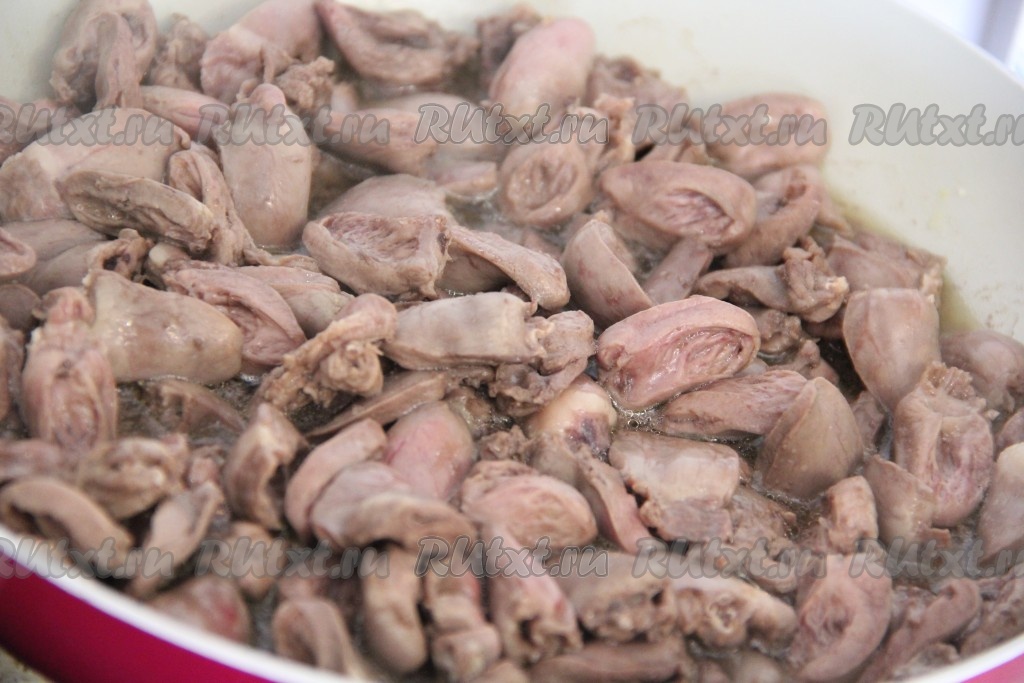 Куриные сердечки откинуть на дуршлаг, чтобы стекла лишняя жидкость, затем разрезать на две части. В сковороду влить масло и выложить сердечки.
