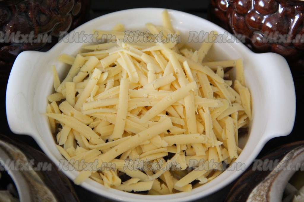 Сыр натереть на крупной тёрке и выложить поверх грибов. Накрыть крышками горшочки с куриными сердечками и картошкой, поставить в разогретую духовку. Готовить жаркое 30 минут при температуре 200 градусов.
