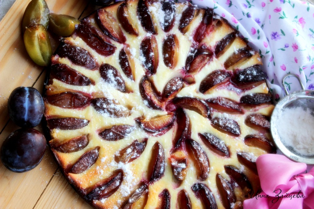 Отправить форму с пирогом в заранее нагретую до 180 градусов духовку на 30-40 минут. Перед подачей дать полностью остыть. При желании очень вкусный пирог с творогом и сливами посыпать сахарной пудрой.