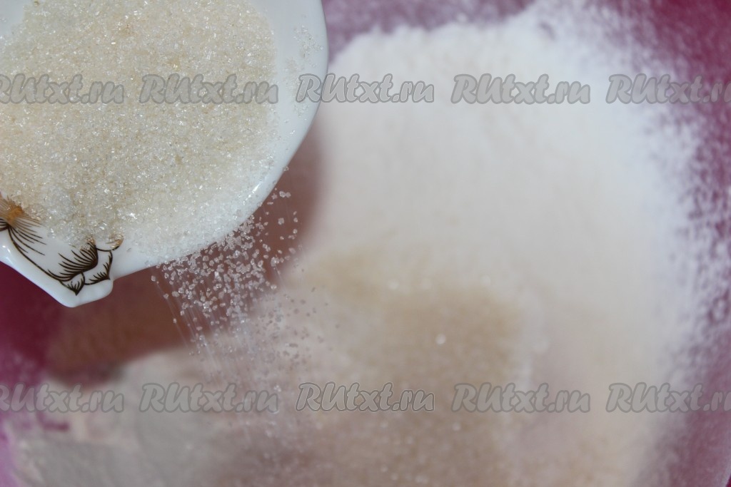 В миске соединить натертое сливочное масло и просеянную муку. Добавить сахар.