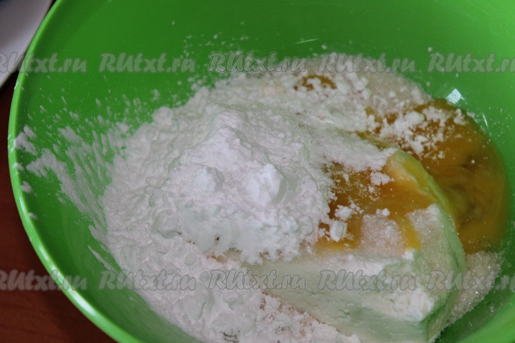 Для приготовления творожной начинки необходимо в миске соединить творог, сахар, ванильный сахар, крахмал и желток.