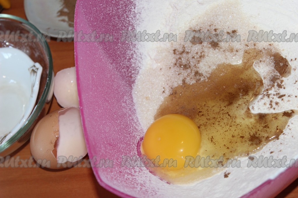 Туда же вбить яйцо. Затем добавить щепотку соли и щепотку корицы. Тщательно перемешать, слепить из теста шар (тесто должно быть мягкое, однородное и не липнущее к рукам). Готовое тесто завернуть в пищевую пленку и отправить в холодильник примерно на 1 час.