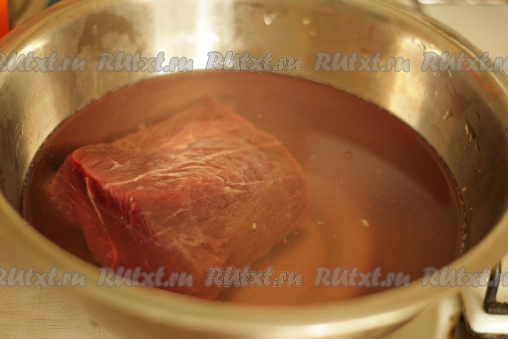 Говядину замочить в солевом растворе. На 1 стакан воды - 2 ч. л. соли. Оставить на 2 часа.