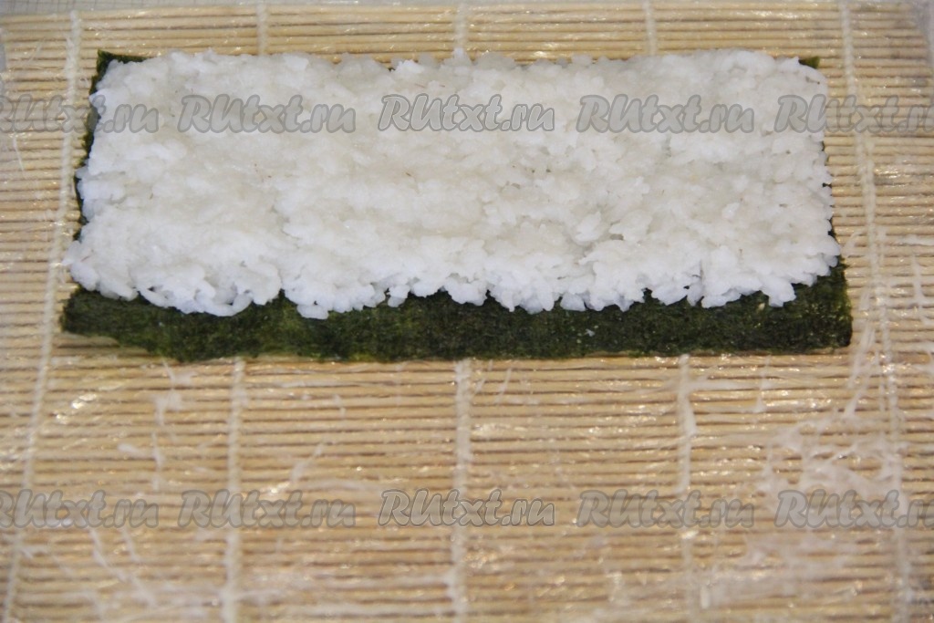 Подготовить циновку. Лист нори разрезать на две части. На циновку положить лист нори блестящей стороной вниз. Выложить часть риса и разровнять его по поверхности листа нори, оставив пустым дальний от вас край шириной 1 см. Чтобы рис не прилипал к рукам, можно руки смочить в подкисленной воде (я в мисочку с водой капаю пару капель лимонного сока или добавляю кристаллы лимонной кислоты).
