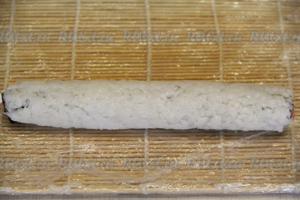 Плотно завернуть ролл с помощью циновки, хорошенечко прижать циновку по всей поверхности ролла.