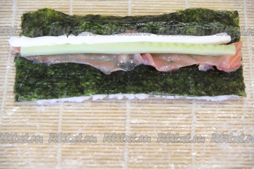 Аккуратно перевернуть лист нори вместе с рисом. Выложить начинку. Я положила кусочки рыбы и огурца. Творожный сыр переложить в пакет или кондитерский мешок, так удобнее формировать начинку. Выдавить творожный сыр.