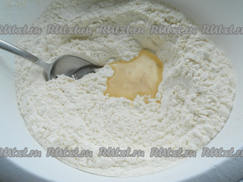 Для того чтобы замесить тесто, нужно в глубокую миску просеять муку, добавить соль, сахар и сухие дрожжи, перемешать. Сделать в муке углубление по середине и влить туда растительное масло.