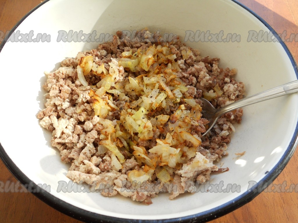 Лук очистить, мелко нарезать и обжарить на растительном масле до золотистого цвета (в течение 5-7 минут) на среднем огне, периодически помешивая, затем остудить и добавить в перекрученное мясо. Посолить, поперчить, влить примерно 50 миллилитров бульона, в котором варилось мясо, перемешать. Мясная начинка для пирожков готова.