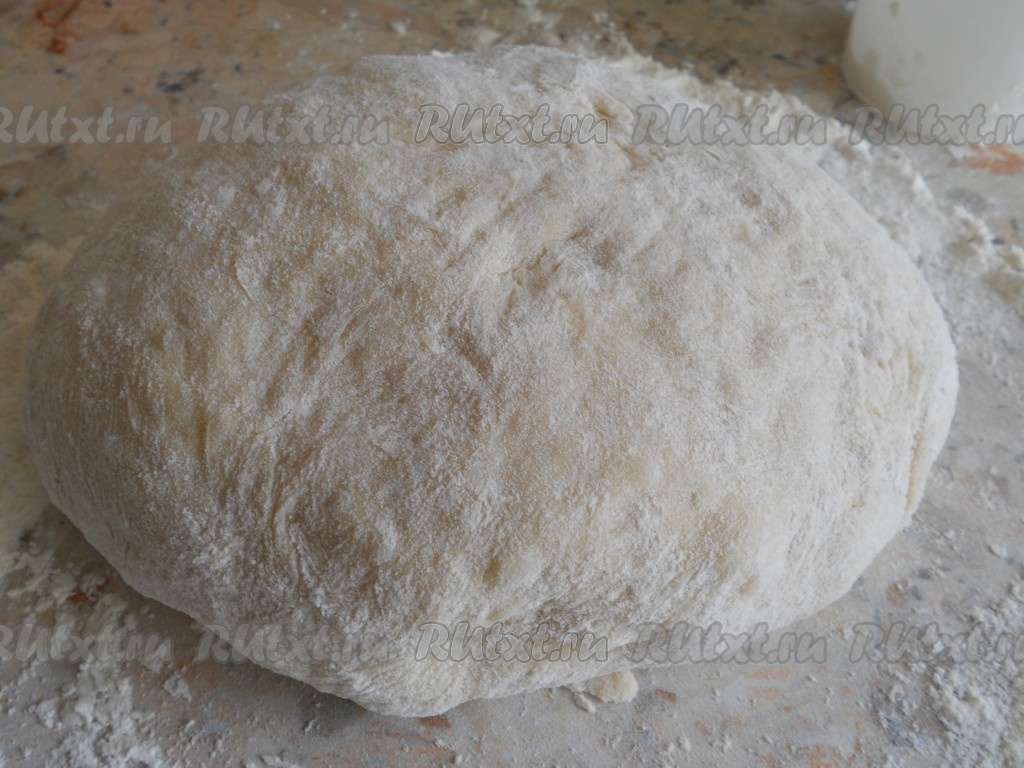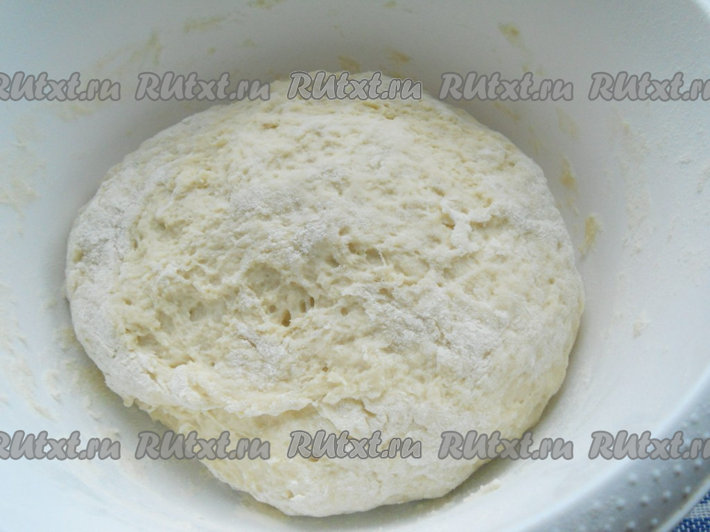 Накрыть миску с тестом полотенцем и убрать в тёплое место для подхода на 1 час. Подошедшее тесто увеличится в объёме раза в 2-3, обмять его, подсыпав, если необходимо, ещё немного муки.