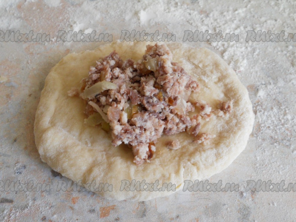 Разделить тесто на 4 части, из каждой скатать колбаску, которую нарезать на части (вес каждой части 60-70 грамм). Каждую часть теста скатать в шарик и приплюснуть в лепёшку. На середину лепёшки поместить 1 столовую ложку мясной начинки, сформировать пирожок