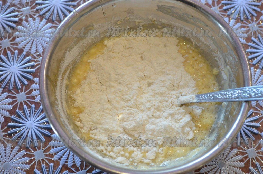 Добавляем муку и перемешиваем. Кляр получится средней густоты, не жидкий.