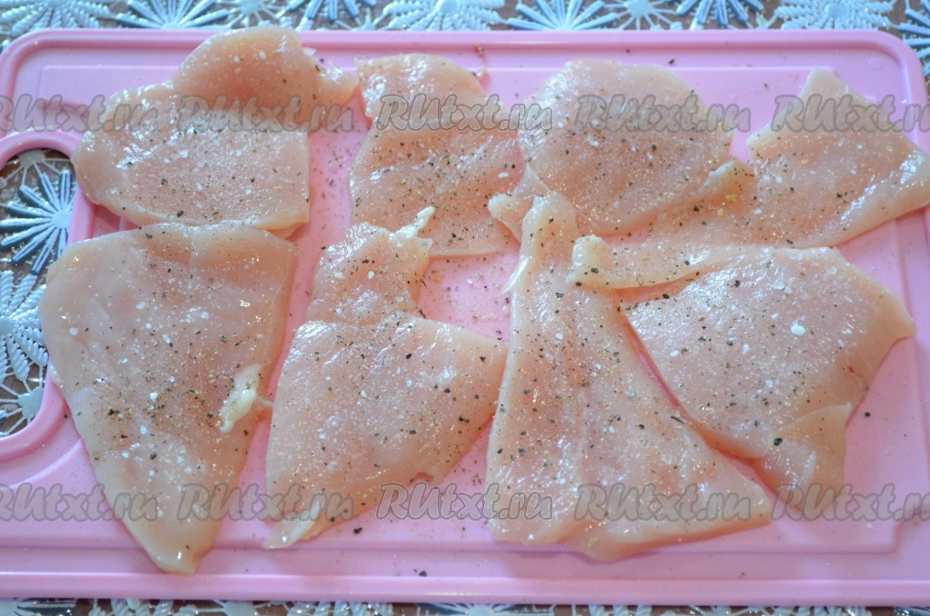 Нарезаем куриное филе на тонкие пластины, солим и перчим с обеих сторон, оставляем его минут на 15.