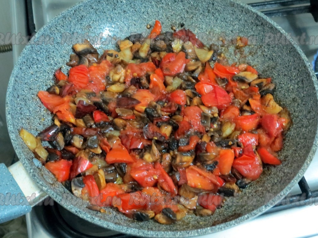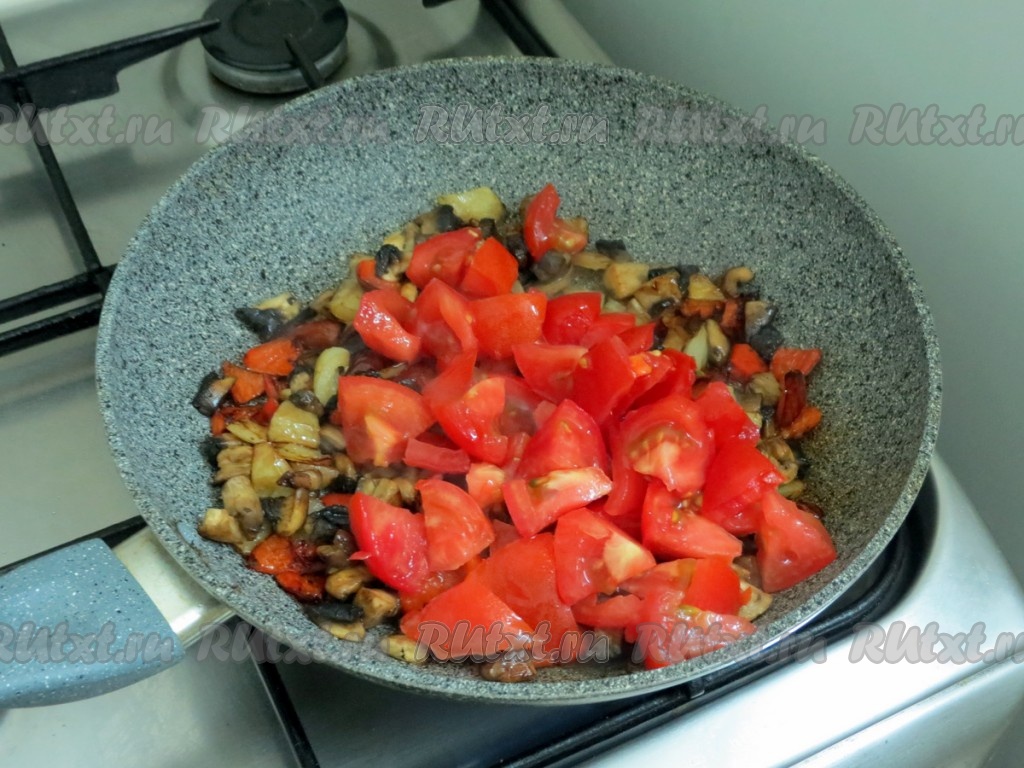 Помидоры нарезаем небольшими кусочками и добавляем их в сковороду, перемешиваем и обжариваем 2-3 минуты. Солим, но очень осторожно, учитывая то, что в состав начинки будет входить твёрдый сыр, а он солёный.