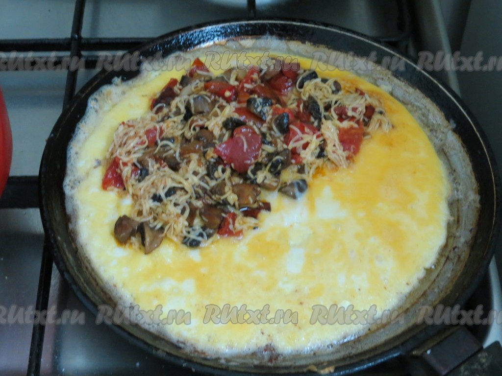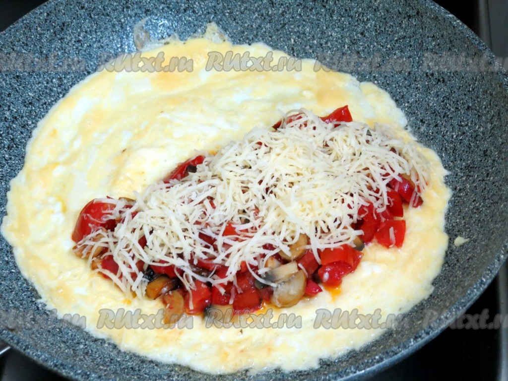 Второй омлет готовим точно также, только сверху начинку посыпаем тертым сыром, а потом уже накрываем второй половинкой омлета.