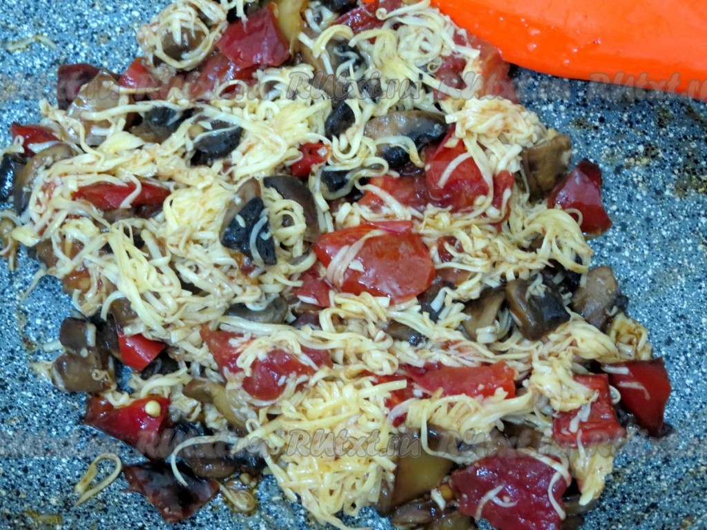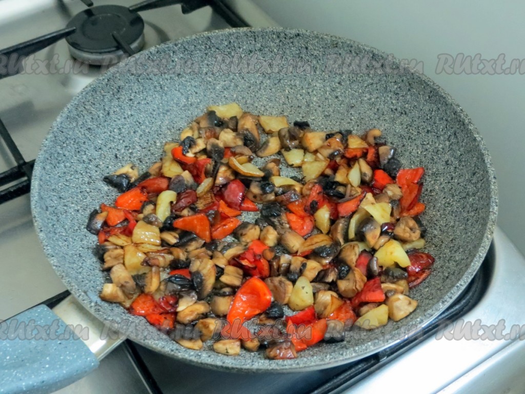 К перцу добавляем шампиньоны и продолжаем жарить вместе, иногда помешивая, в течение 2-3 минут.