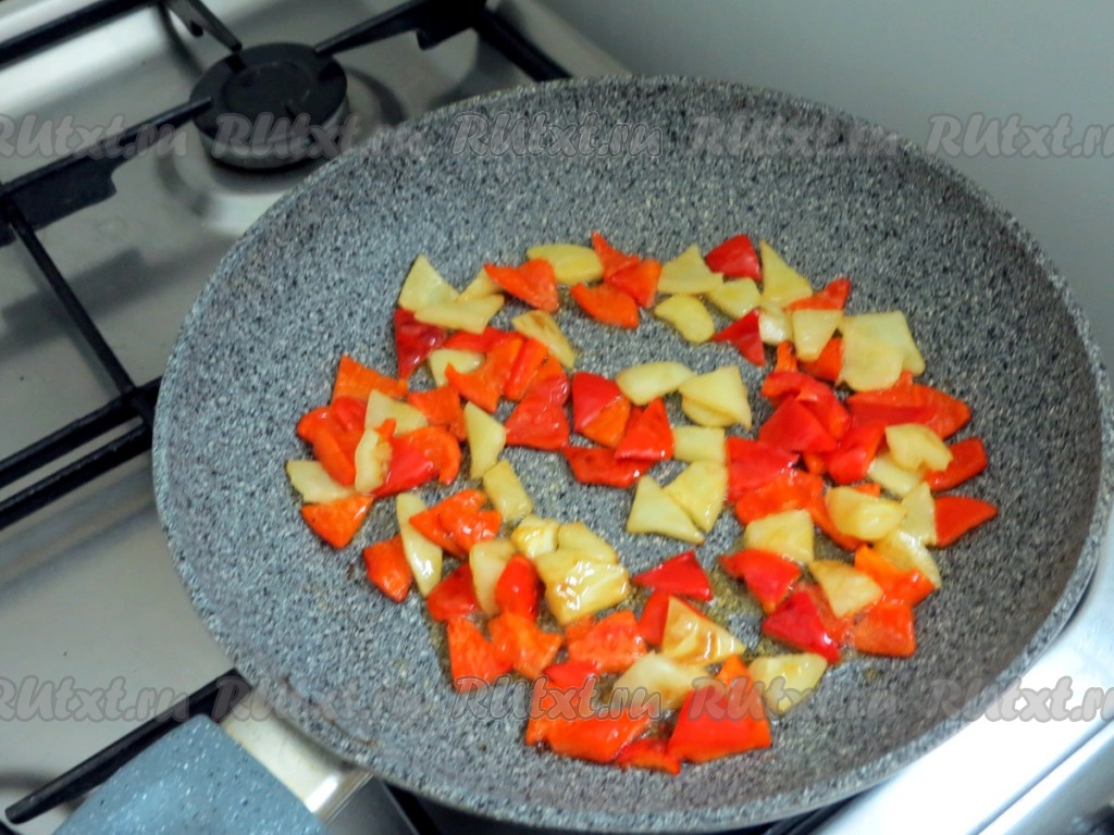 Перец обжариваем на заранее разогретой сковороде, на растительном масле, иногда перемешивая, в течение 3-4 минут.