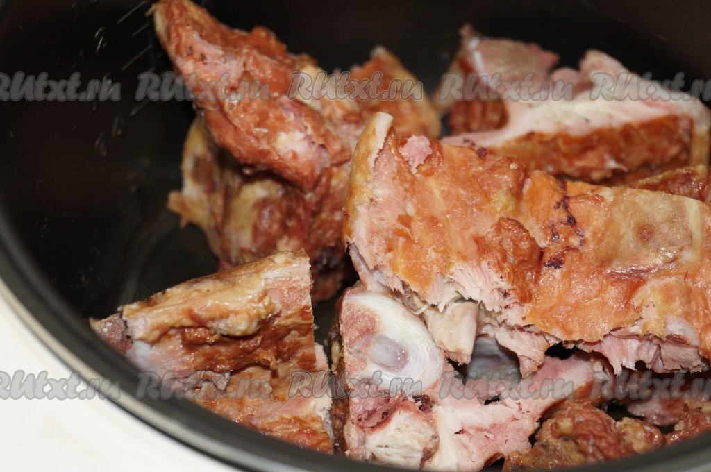 На дно чаши мультиварки влить немного растительного масла. Копчёные ребрышки вымыть, разрубить на порционные куски и отправить в чашу мультиварки. Готовить рёбрышки на программе "Жарка" или "Пароварка" минут на 10-15, периодически помешивая, крышку закрывать не надо.