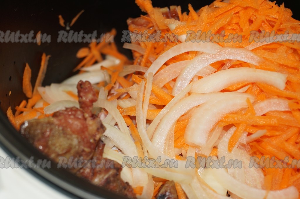 Репчатый лук и морковь очистить, морковь натереть на крупной тёрке, а репчатый лук нарезать полукольцами. Добавить овощи к копчёным рёбрышкам в чашу мультиварки и жарить, помешивая, еще минут 10, функцию "Жарка" или "Пароварка" отключить.