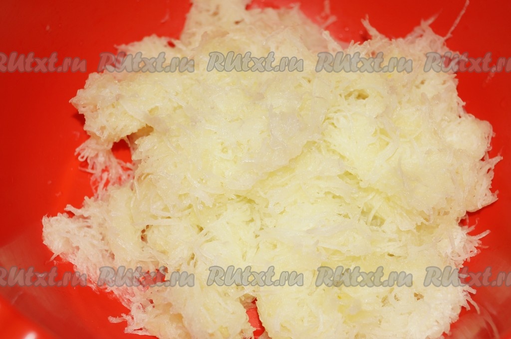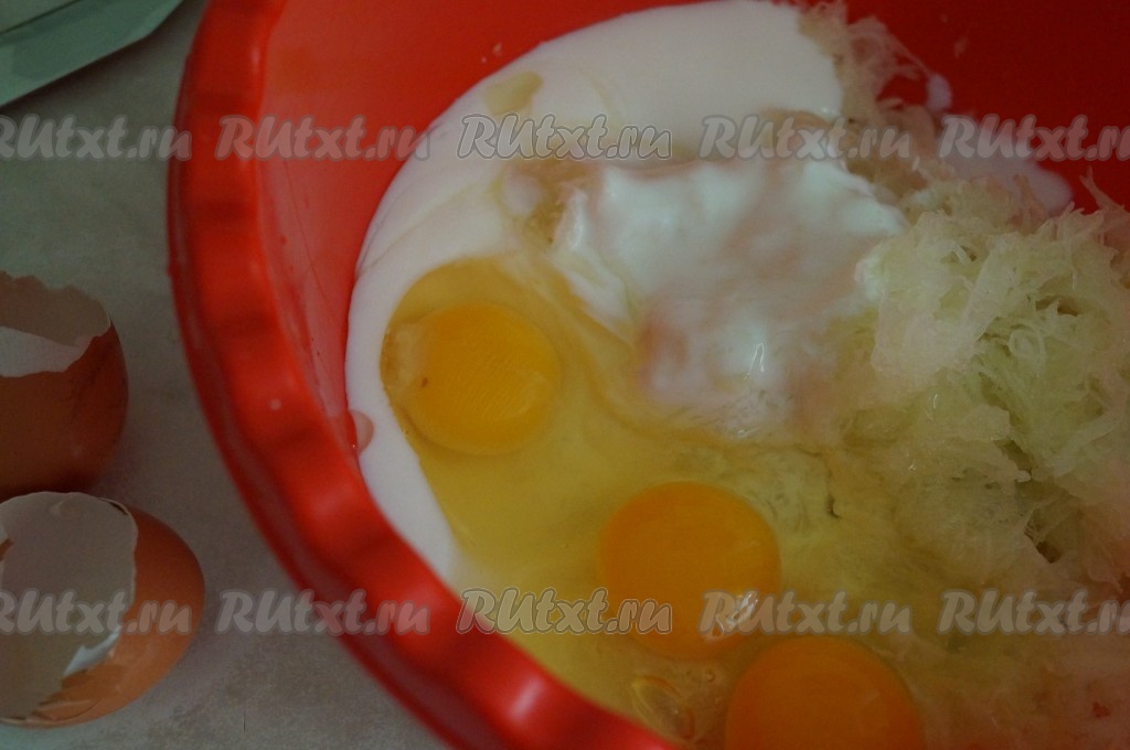 Кабачок, натёртый на мелкой тёрке, выложить в миску, в которой будем замешивать тесто.