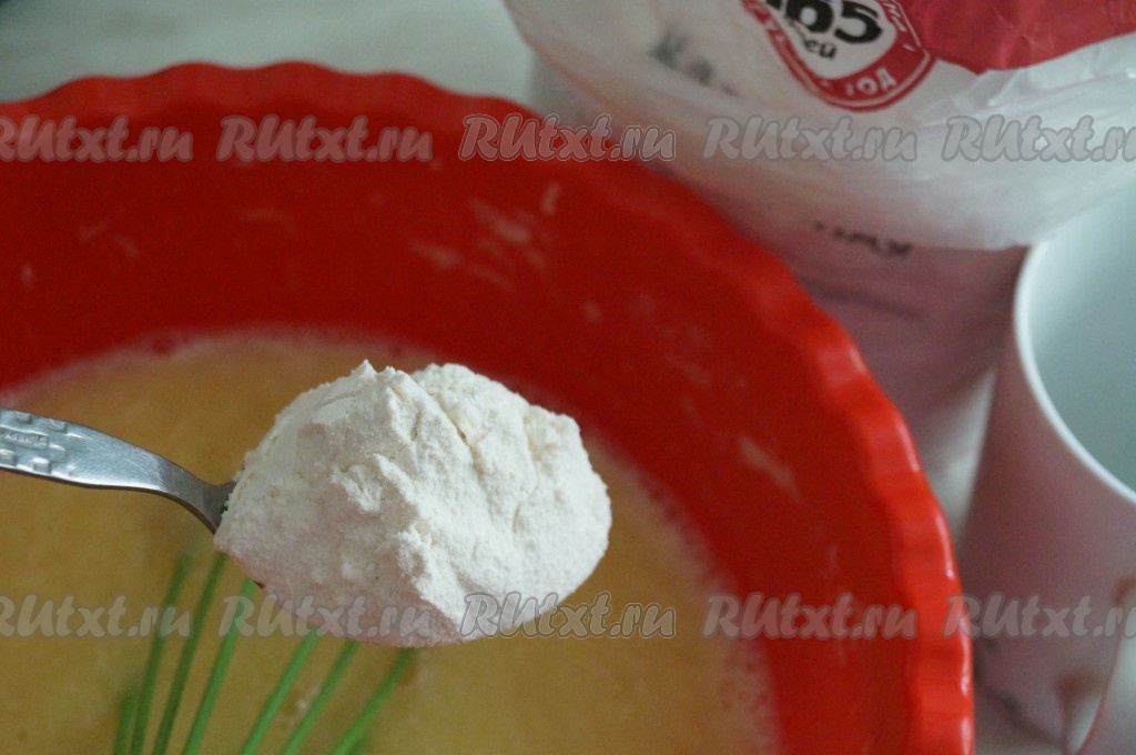 Добавить в тесто просеянную муку. Затем в крутой кипяток добавить соду и перемешать, вылить в тесто, хорошенько взбить венчиком.