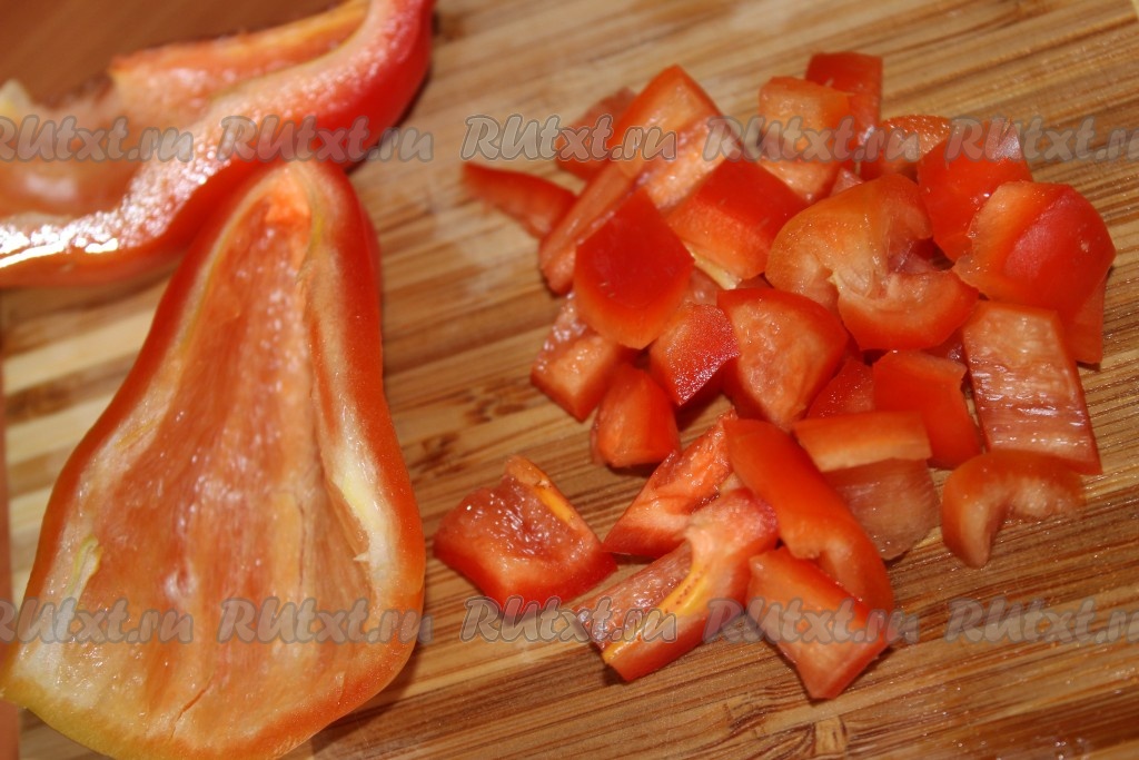 Сладкий перец очистить от семян и нарезать небольшими кубиками.