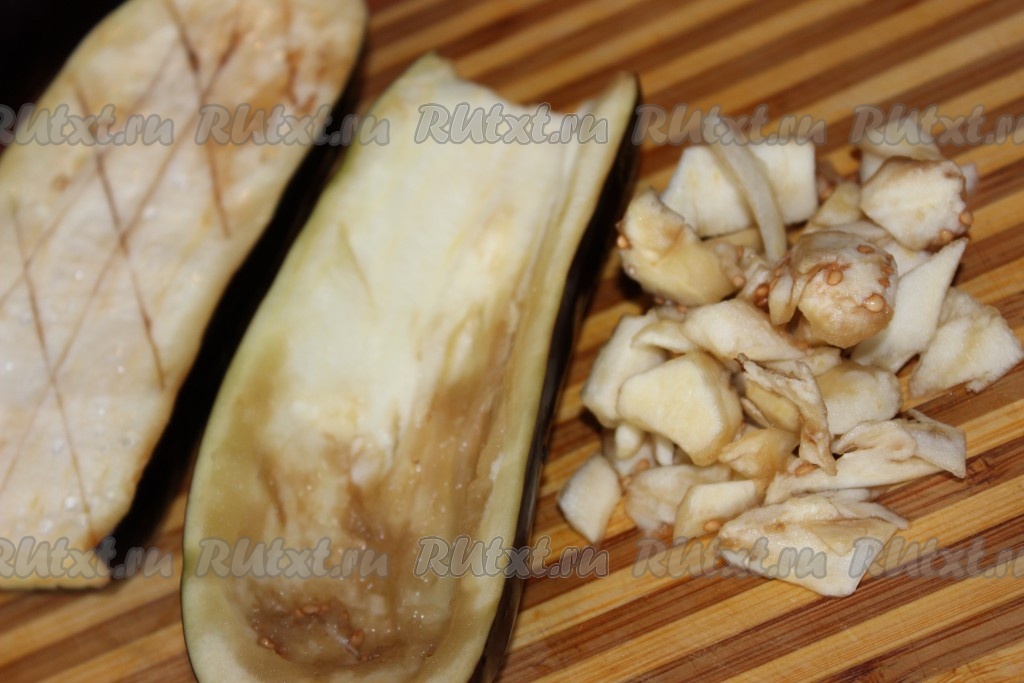 Баклажаны вымыть, удалить плодоножку, разрезать на две половинки. Небольшим ножом сделать надрезы в каждой половине и с помощью чайной ложки аккуратно вынуть мякоть, оставляя стеночки толщиной примерно 1 см. Таким образом у нас получатся "лодочки". Получившиеся лодочки посолить и оставить примерно на 30 минут, чтобы ушла вся горечь. Мякоть нарезать небольшими кубиками.