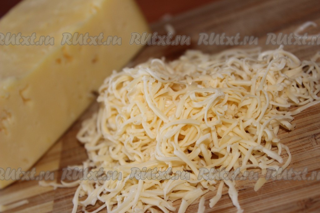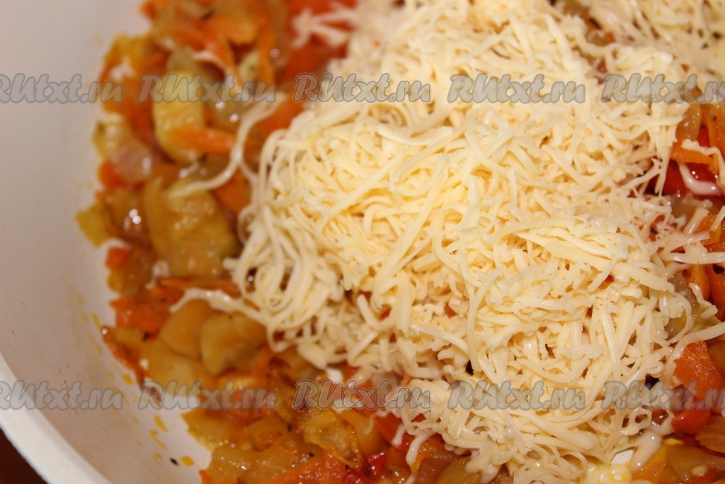 Пока овощи тушатся, натереть сыр  на мелкой терке. Часть сыра отложить для посыпки.
