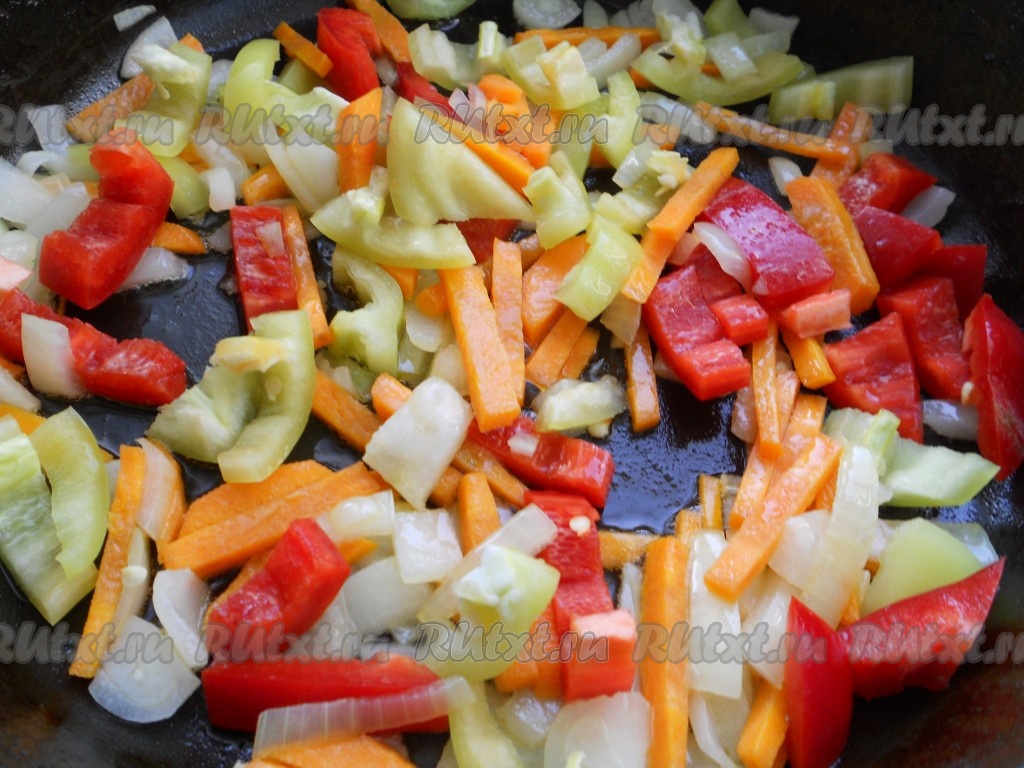 Добавить в сковороду нарезанный соломкой сладкий болгарский перец (лучше разных цветов). Обжаривать вместе с луком и морковью на среднем огне также 2-3 минуты, помешивая.