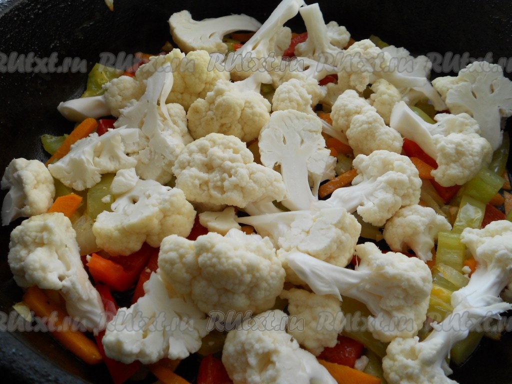 Далее к овощам добавить цветную капусту, разобранную на соцветия (если слишком крупные - разрезать на 2 части).